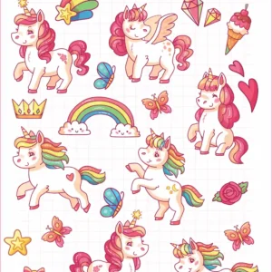 این استیکر یونیکورن فانتزی با رنگهای شاد و طرحهای کودکپسند، حس رویاپردازی و شادی را به فضای اطرافتان میآورد. مناسب برای تزئین اتاق کودک، هدیه تولد یا استفاده روزمره.